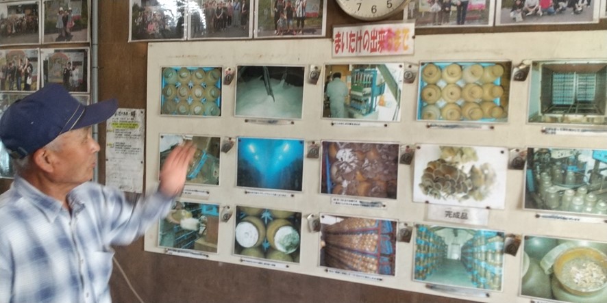 案内して下さったのは、まいたけ作り34年の東さん。三菱重工を脱サラした後、会社を始めた異色の経歴の持ち主で、まいたけ作りの知識0から始められたそうです。国産のおがくずの使用、地元の天然水を利用するなど試行錯誤を重ねていくうちに、肉厚がしっかり、味の濃いまいたけ作りができるようになったそうです。
