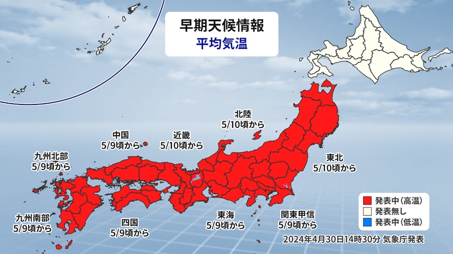 また、気象庁は4月30日に「高温に関する早期天候情報」を発表しました。これは、発表日の6日後〜14日後までを対象として、5日間の平均気温が「かなり高い」もしくは「かなり低い」となる確率が30%以上と見込まれる場合に発表されます。