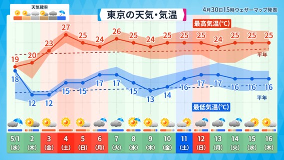こうして考えると、5月は単発で猛暑となる日は少ないかもしれませんね。その一方で、「5月に入ってから、ずーっと暑いなー。」とか、「〇日連続で25℃以上の夏日で暑い」というような所が全国的に出てくるかもしれません。また東京以外の地点をご覧になりたい方はhttps://forecast.weathermap.jp/をぜひご確認ください。
