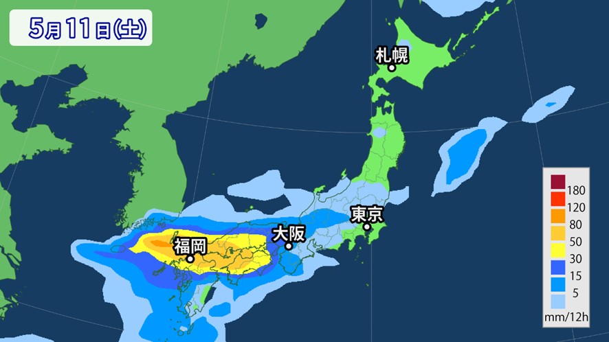 スーパーコンピュータによるこの先の雨雲の動きも見ていきましょう。今月はまだ梅雨時期のような長時間の雨が降り続くというよりは、発達した低気圧に伴う単発の大雨に注意が必要となりそうです。台風並みの暴風や大雨となりやすいこの時期の低気圧は「メイストーム」などと呼ばれたりします。