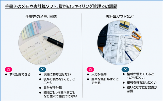 複数人での作業進捗の共有は作業を効率的に進める上で重要ですが、日々の作業記録を手書きの日誌や管理表などで管理していると、以下の点で不便を感じる場面があります。