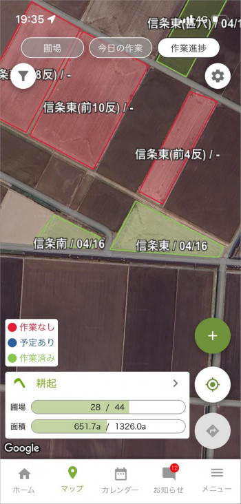 アグリノートに日々の作業記録をつけていくと、マップ上の圃場が作業の進捗度に応じた色で表示されるので、作業の抜け漏れを確認できます。下の画像はアグリノート:モバイルアプリ版で耕起作業の作業進捗を表示した状態です。耕起作業をした圃場は緑色(=作業済み)、耕起作業をしていない圃場は赤色(=作業なし)で表示されます。