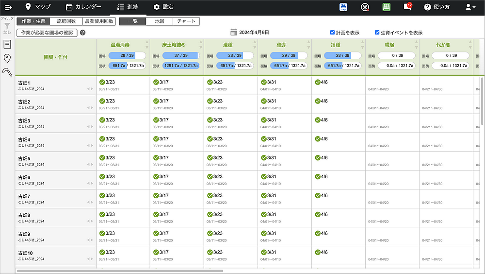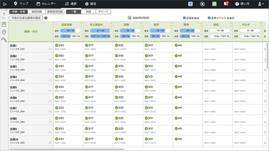 ▼アグリノート パソコンブラウザ版での圃場ごとの作業進捗の一覧表示