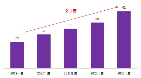 冷凍ブルーベリーの市場規模は年々増加しており、2023年度は2019年度と比べて2.1倍の62億円に伸長していました。冷凍ブルーベリーの販売金額は、2023年度の冷凍果実全体の販売金額のうちおよそ半分を占めており、人気が高まっているとわかります。
