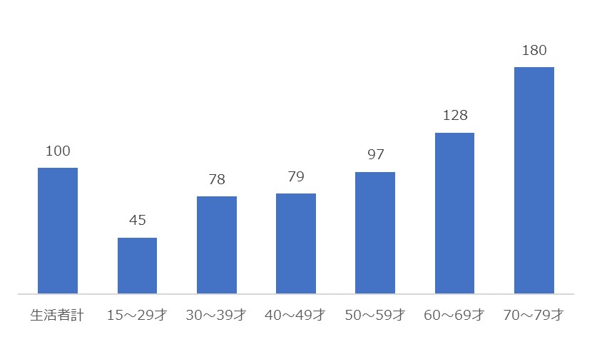 次に、どのような人が冷凍ブルーベリーを購入しているのでしょうか。インテージ消費者パネル「SCI」から、生活者計の購入金額を100とした場合の各年代の購入金額を見てみましょう。インテージSCIとは、全国15歳-79歳の男女約50,000人のモニターから、継続的に収集している日々の買い物データです。