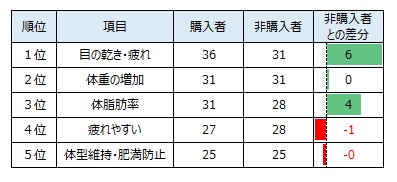 「目の乾き・疲れ」の回答が最も多く、冷凍ブルーベリーを購入していない人と比べると6ポイント回答率が高いことがわかりました。冷凍ブルーベリーの購入金額は年代が上がるほど多かったことから、加齢に伴う視力低下が気になって購入されていると推察されます。