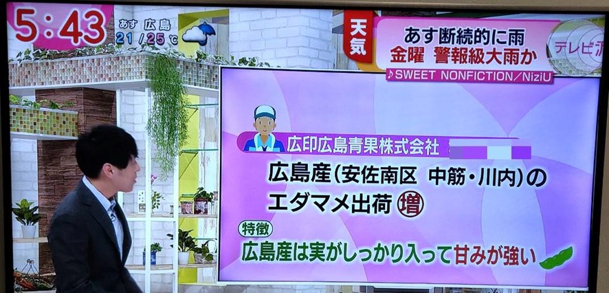 例えば、「広島県内は、3月の低温で生育の停滞や出荷の遅れなどが目立つ野菜が多かったですが、4月に入り晴れて暖かさが戻った事で広島産野菜も出荷量が少しずつ増えてきています。そんな中で今は枝豆がオススメです。」などと楽しく紹介する訳です。視聴者(消費者)そして生産者の方に喜んでもらえるような番組作りできたらと常に思っています。