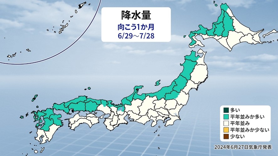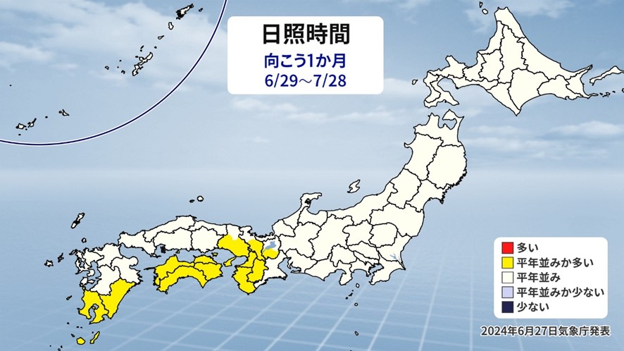 一方で、1か月予報の日照時間を見てみると、西日本を中心に並か多い予想となっています。さらに細かく言うと、7月13日以降は西日本で晴れる日が多くなる見込みとしています。西日本の梅雨明けの平年値は7月15〜19日という所が多いです。今年も例年と同じくらいの梅雨明けとなるかもしれません。梅雨末期となる今月前半に一気に大雨、そして例年通りの梅雨明けになるのではないかが少し心配な所です。