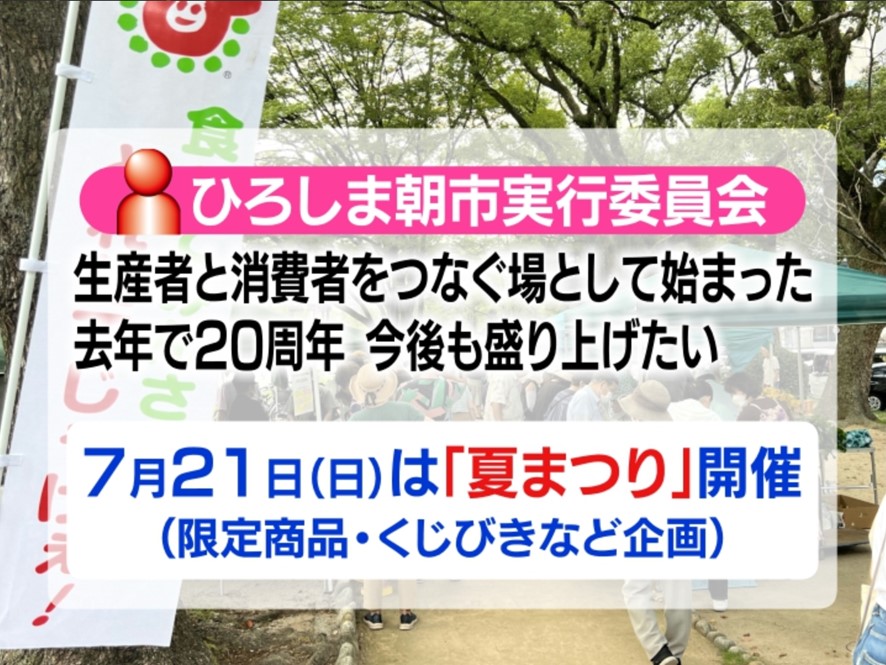 生産者と消費者をつなぐ場として始まった「ひろしま朝市」は昨年で20周年を迎えられたとの事です。これまで20年間、毎週農家の皆さんがお客様一人一人と直接対話しながら商品を販売することを地道に続けてこられたことで、広島の地産地消が根付いたのだろうと、取材を通して感じました。今月21日には、夏まつりが開催されるそうで、今後ますますこの朝市が盛り上がっていきそうです。