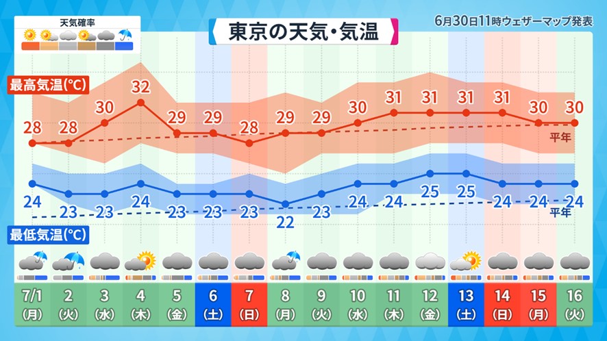 ウェザーマップ独自の16日予報です。東京は基本的には、まだしばらくは曇りや雨の梅雨空が続きそうです。気温を見てみるとアップダウンはあっても、極端に低くなる梅雨寒という日はなく、25度以上の蒸し暑さが予想されます。また東京以外の地点をご覧になりたい方はhttps://forecast.weathermap.jp/をぜひご確認ください。