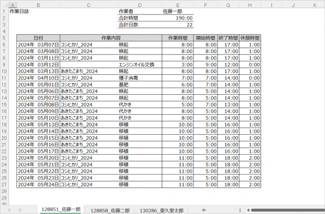 ▼アグリノート 出力機能による「作業者別作業時間集計表」