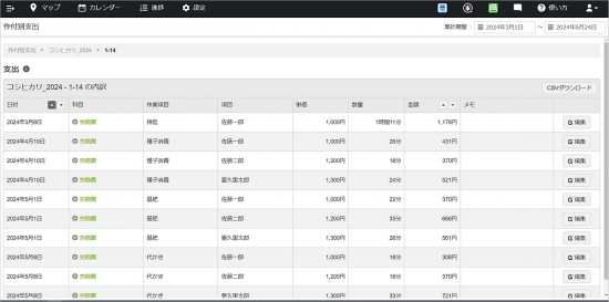 ▼アグリノート パソコンブラウザ版での支出(労務費)を表示した画面