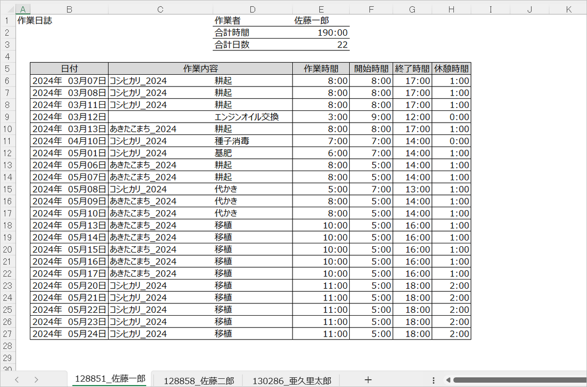 圃場別、作付別、作業項目別、作業者別、などさまざまな視点で時間を把握できます。