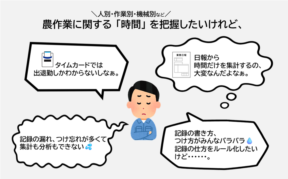 生産者の皆さんとお話しをする中で、「誰が・どの作業を・どれくらいの時間行ったのか、稼働した時間を把握したい」という要望をよく伺います。