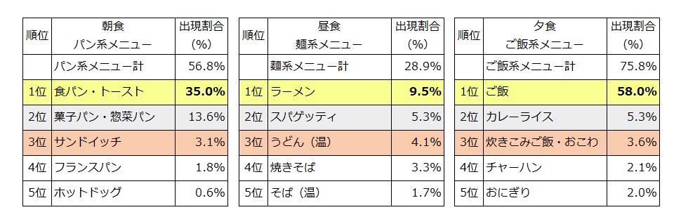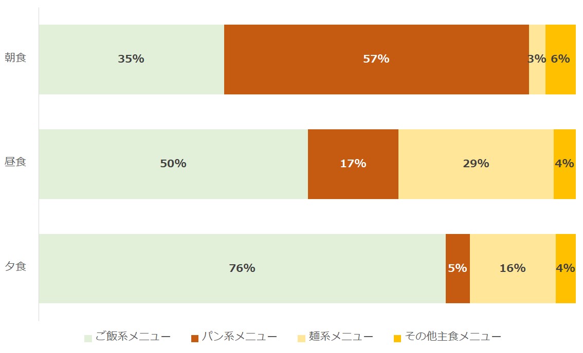 また、昼食では麺系メニューが朝食や夕食と比べて高くなっており、それぞれのシーンで選ばれるメニューに特徴があることがわかりました。それでは、具体的にはどういった主食メニューが食べられているのでしょうか。