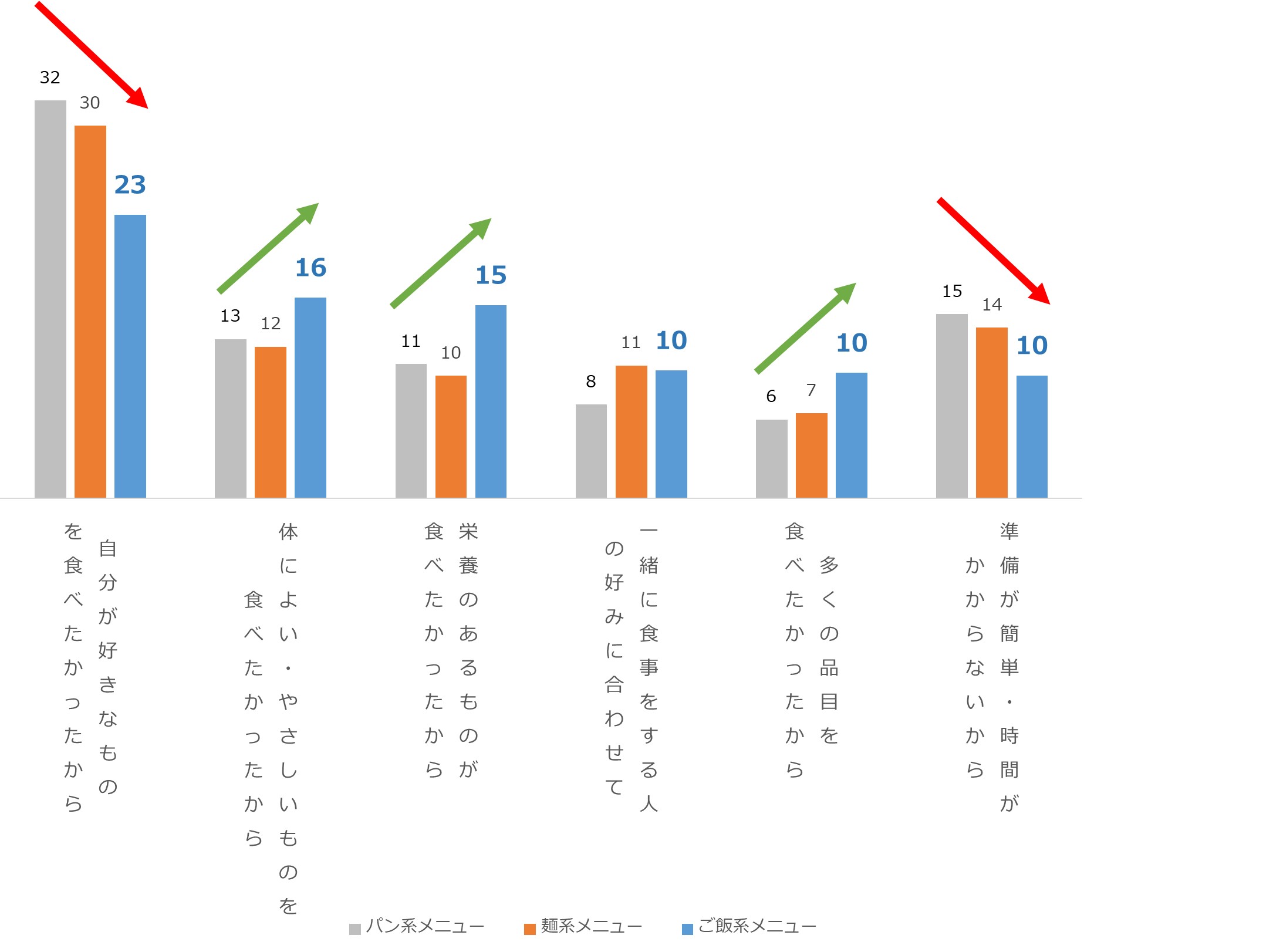 夕食シーンでご飯系メニューを食べている人は、麺系メニューやパン系メニューを食べている人に比べて、「栄養のあるものが食べたかったから」「多くの品目を食べたかったから」「体によい・やさしいものを食べたかったから」が4〜5ポイント程度高くなっていました。