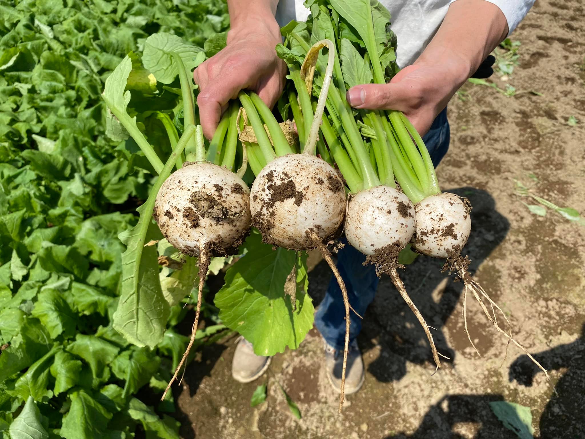 そして迎えた夏の収穫期。インターン生は北海道の農園まで足を運び、自分も蕪の黄色い葉を取り除くなど、作り上げた品質管理工程を「使ってみる」現場体験をしていました。楽しそうなだけでなく、実際に自分でもやってみることで改善点が見えてきて、早速社長に提案されている姿も印象的でした。(詳細はこちら)