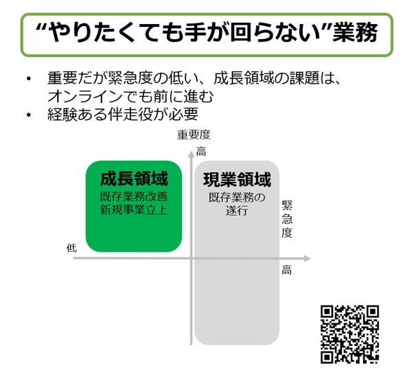 50代会社員との協働「大人のインターンシップ」も、オンラインから始めるケースが9割以上。当然、向く業務・向かない業務があります。「大人のインターンシップが威力を発揮する業務」それは「急いでいないけれど、大事なこと」。