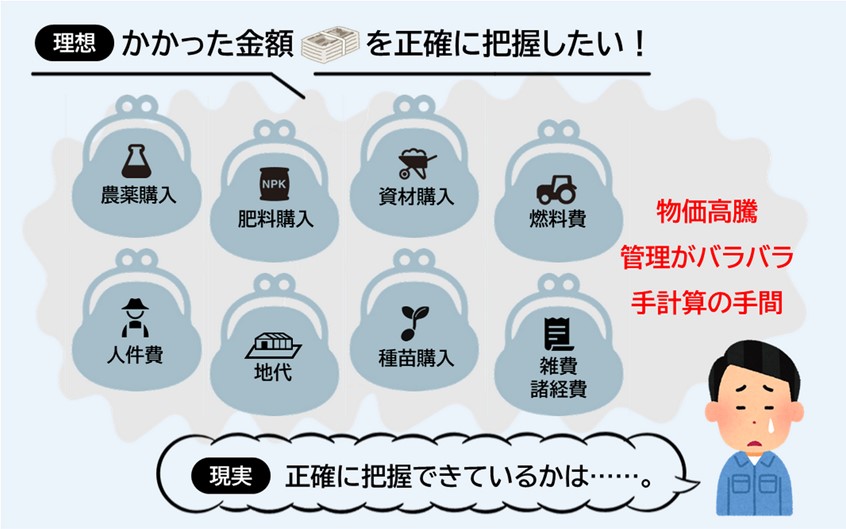 農作業の記録のデータ化によって解決したいことのひとつに、「コストの集計」があると思います。昨今の物価高騰の影響から資材類を購入するたびに価格が変わってコスト管理が難しくなったと感じている方や、資材類を無駄なく適切に購入するために、現状を把握して改善したいという方も多いのではないでしょうか。