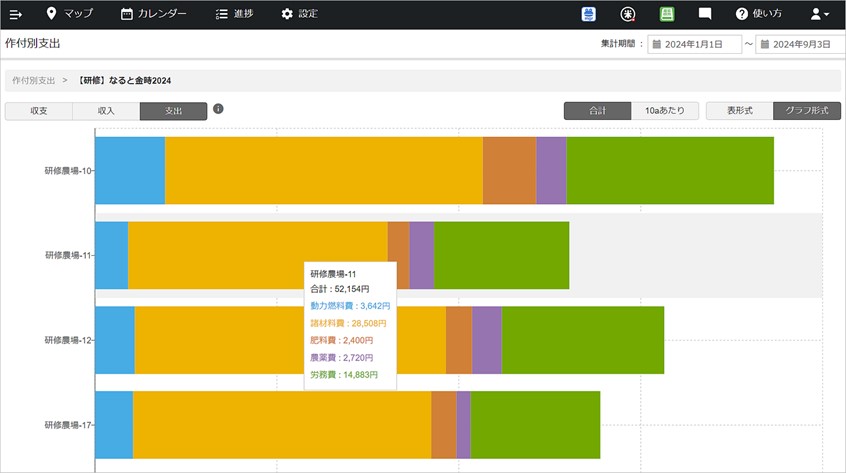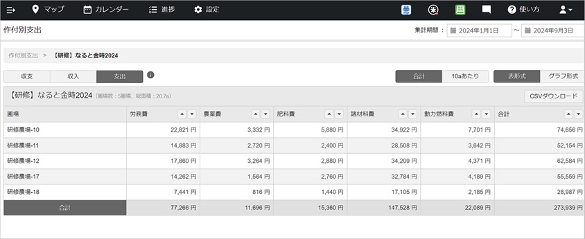 アグリノートには「収支」の機能があり、《単価》の設定に応じて自動で計算されたさまざまなコストを、作付別や圃場別に見たり、期間を区切って確認することができます。