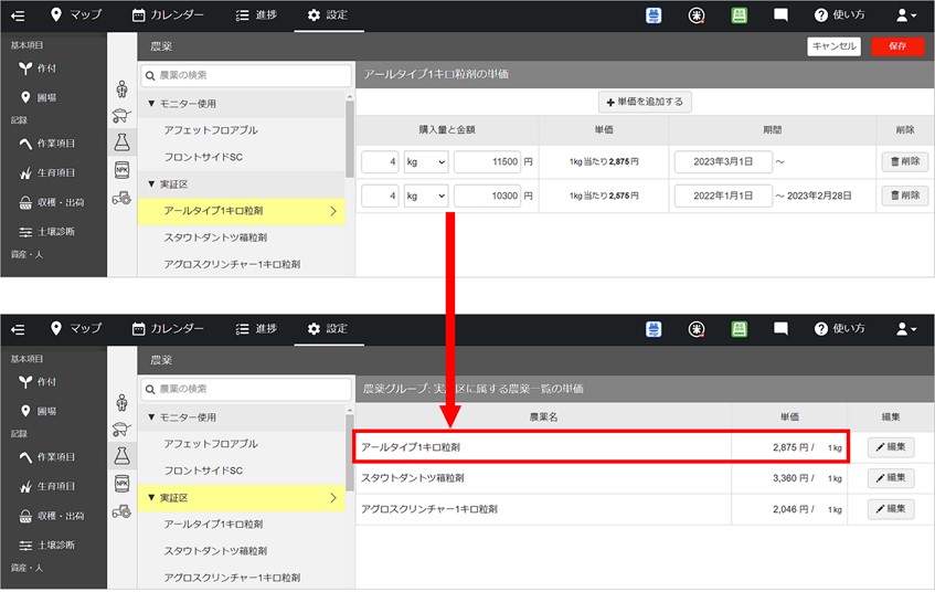 ▼アグリノート 単価設定のイメージ