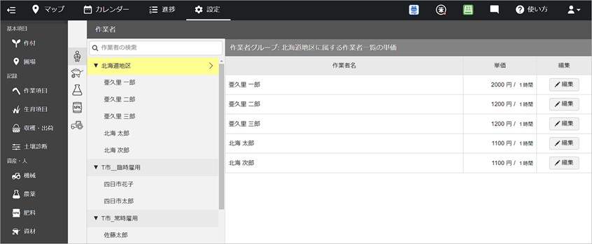 人件費についても同じように、《単価》設定の作業者欄にスタッフ名と時給を設定します。あとは日々の作業記録の作業時間に応じて人件費が自動で計算されます。