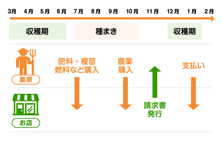 収穫期の前に請求書が届き、収穫期に支払うことができれば売上から運転資金をまかなえますが、そうでない場合はまだ売上の生じない播種期前後に運転資金を捻出しなければなりません。