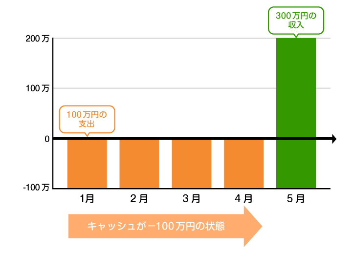 このキャッシュの流れ(キャッシュフロー)を見える化して計画を立てておかないと、黒字の見込みでも、支払時期に資金不足で支払いができず、事業が継続できなくなることも起こりえます。もし資金不足が予測される場合は、一時的な融資などの何らかの方法での対処が必要です。