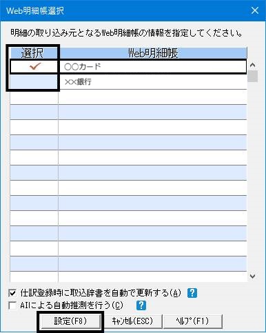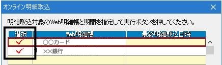 「Web明細取込」をクリックして表示された画面では、取り込み対象の明細をクリックしてチェックをつけます。