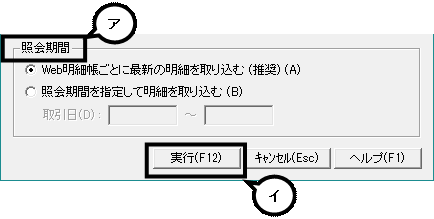チェックを付けたら、照会期間を選択して「実行」をクリックし、明細を取り込みましょう。