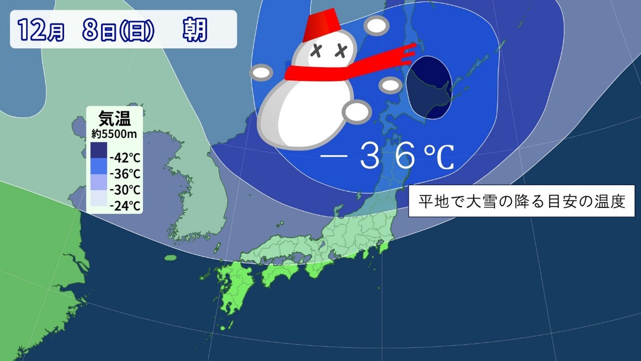 12月8日(日)の予想を見ると、北海道から山形・宮城あたりまで-36℃の寒気に覆われているため、このあたりは一気に雪が降りドカ雪となる可能性が高いのです。