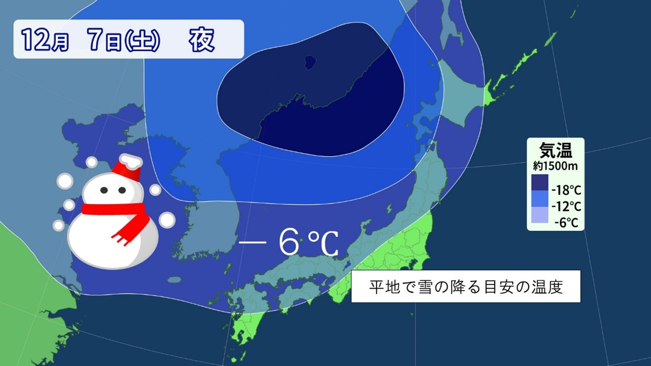 早速、12月7日(土)には北海道から九州の日本海側を中心に-6℃の寒気が流れてくる予想です。この枠内に入っている地域では平地でも雪が降る可能性が高いです。
