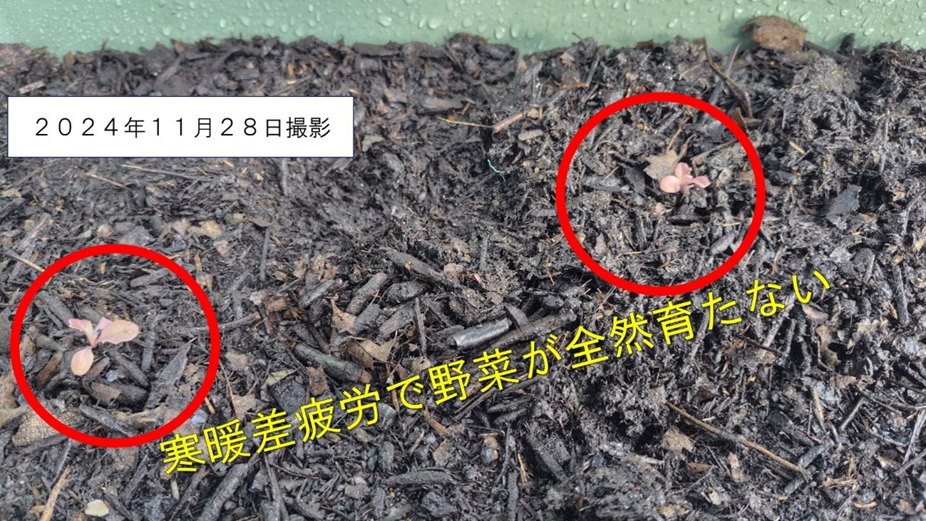 11月に入り、心地よい暖かさの日は少なく日に日に寒さが増していきました。こちらは11月28日に撮った写真です。発芽してから1か月以上経つというのにほとんど成長していません。サニーレタスは暑さが苦手ですが、15℃以下の寒さでは成長が遅くなると言われています。