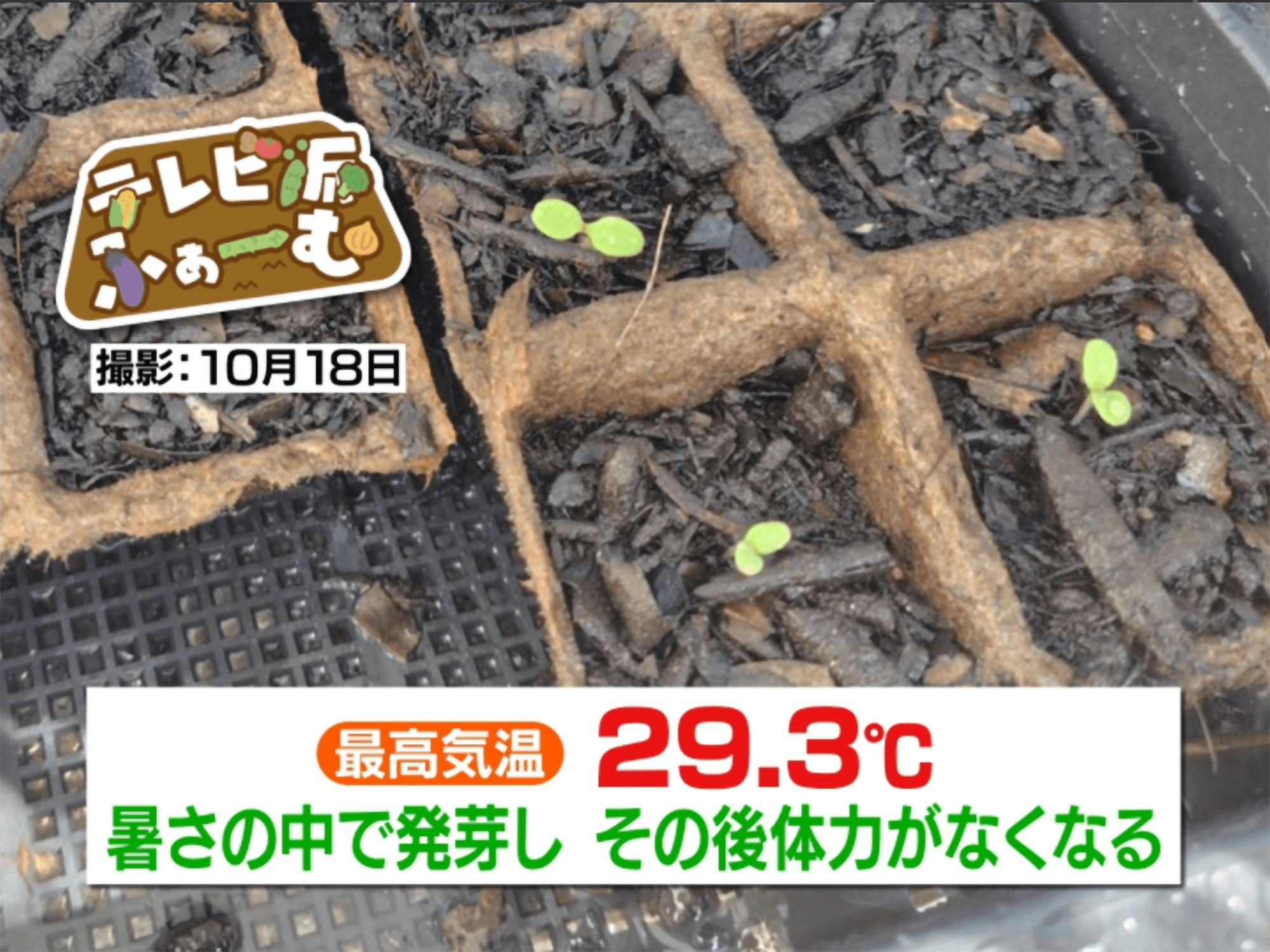10月9日に種をまき、その後10月18日にようやく発芽しました。ただし、この時の気温は29.3℃と9月中旬頃の暑さでした。その後も10月の終わりまで25℃の夏日を観測するなど記録的残暑がサニーレタスの体力を奪いました。