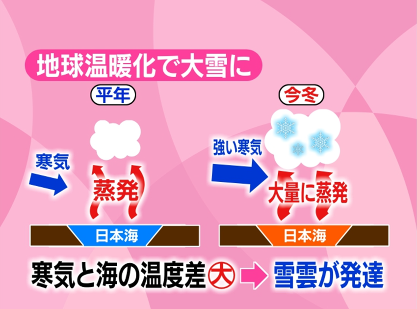 もちろん上空の寒気もどんどん強まりますが、大雪の原因はそれだけではありません。実は、今年の猛烈な暑さとも関係があるんです。