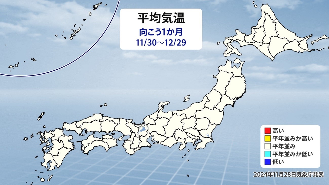 先月28日気象庁発表の1か月予報(平均気温)によると、今月は全国的に平年並みの予想となっています。