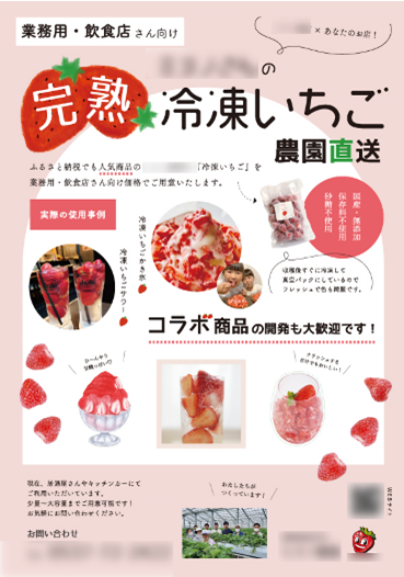 冷蔵庫導入により保管可能量が800kgから2,000kgに増加できたため、栽培計画を見直し、直売所での販売量増加が実現しました。パンフレットは農業系デザイン実績が豊富な弊社デザイナーが担当。デザイン性の高いパンフレット制作・配布によりブランド力が強化され、認知度が向上しました。