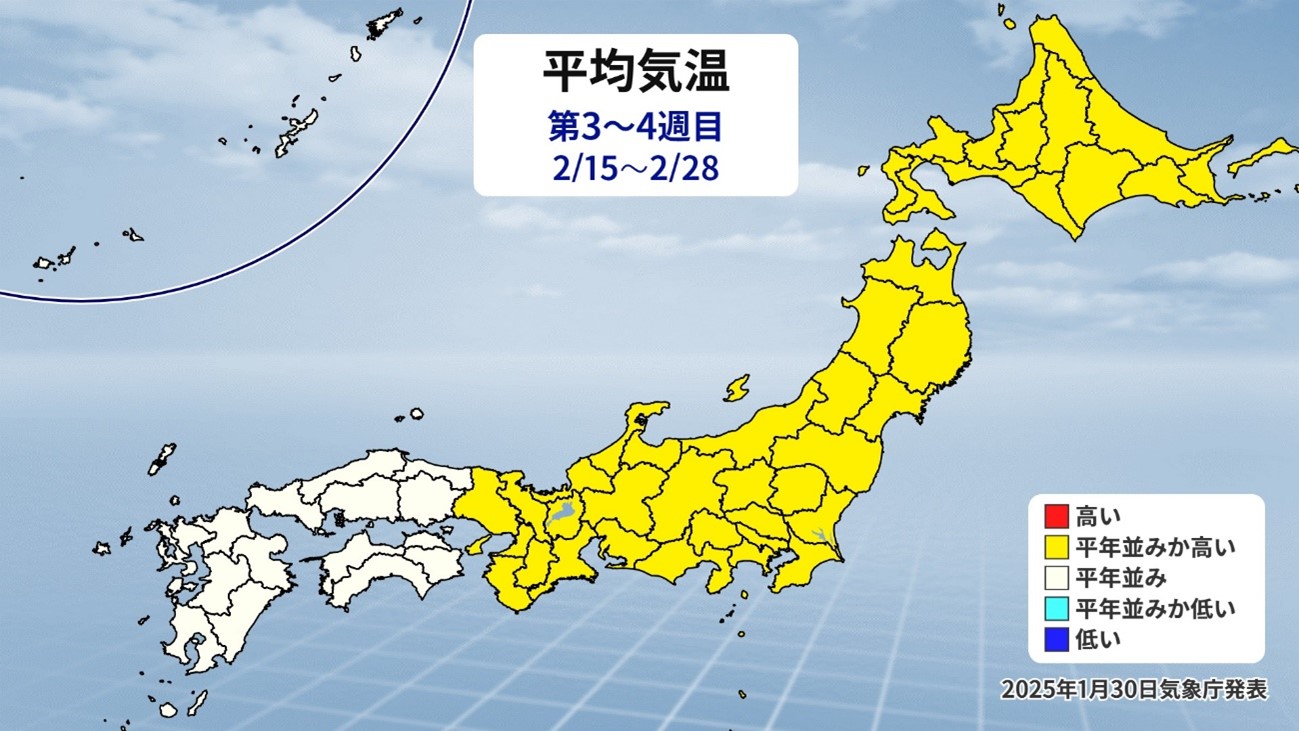 寒波はこの後も沢山やってくるのか気になる所ですが、どうやら今シーズンは2月中旬以降、平年くらいの寒気の到来はあっても、極端に強い寒波は来ないかなと個人的に思っています。というのも、こちらの図をご覧下さい。こちらは気象庁が発表した3か月予報です。