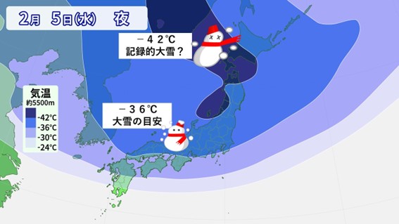 今月は早速、大雪に警戒が必要となりそうです。気象予報士は大雪になるかどうかの目安として、上空の寒気が何℃かを調べます。上空5,500メートルで-36℃以下の寒気が来ると、その空気に覆われる所は「平地でも大雪」となるだろうと大まかに予想しています。