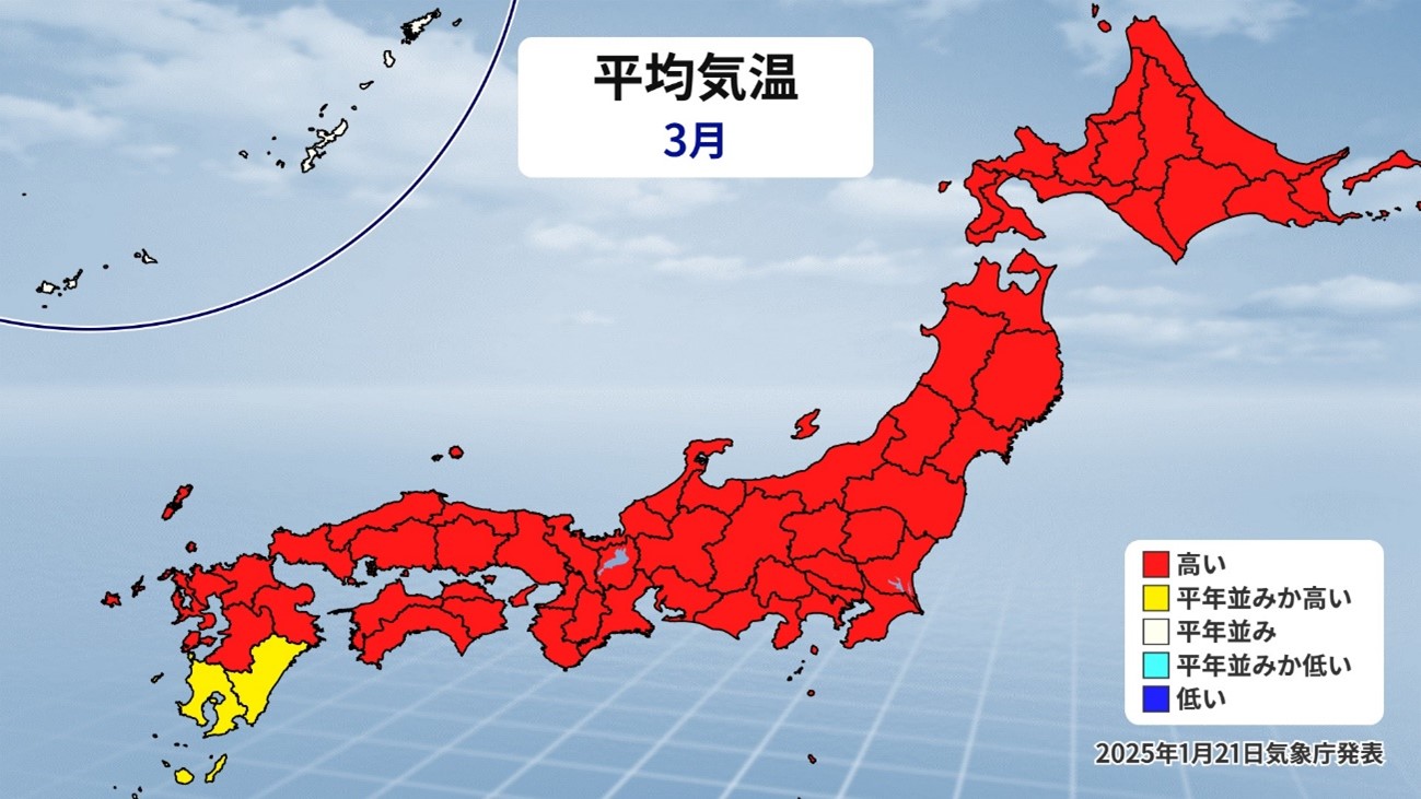 さらに詳しく見ていきます。3月の平均気温の予想です。九州南部や奄美・沖縄を除き、ほぼ全国的に平年より気温が高い予想となっています。3月も全国的に晴れる日が多く、だんだん日差しも強まり気温が上昇し、ぽかぽか陽気の日が多くなりそうです。