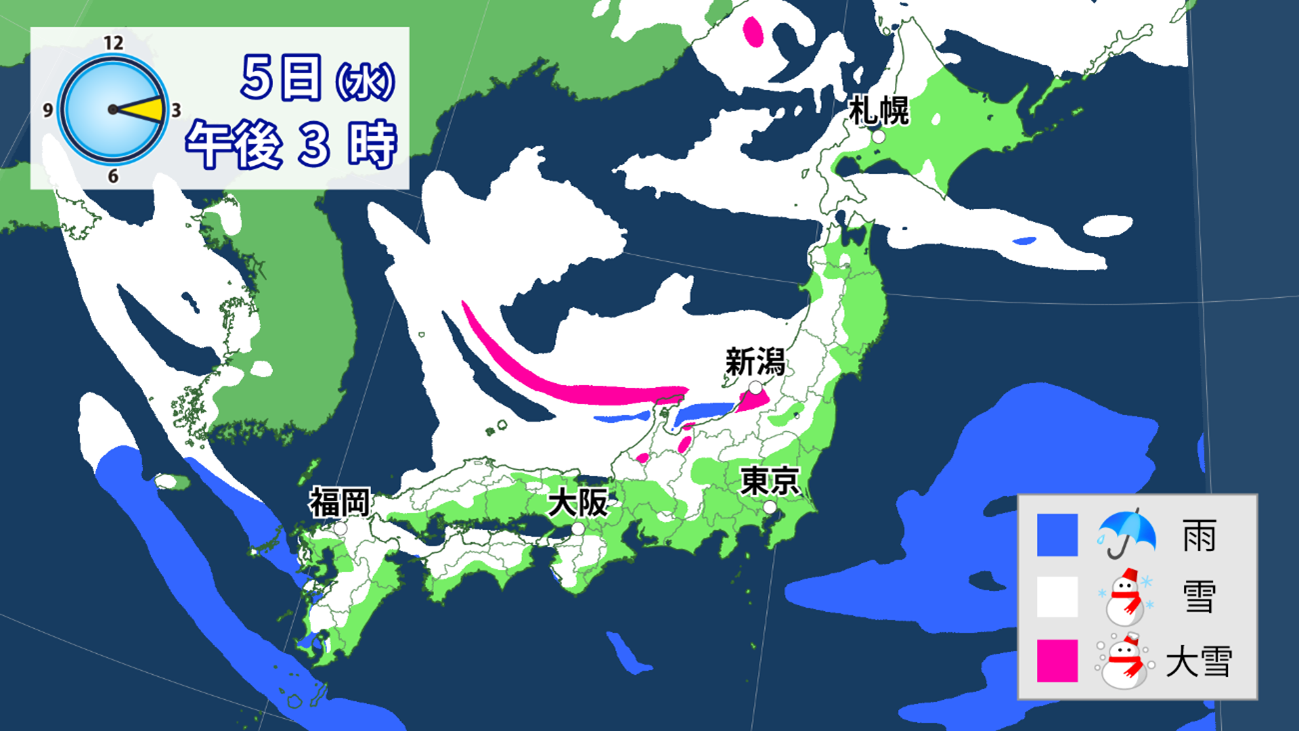 強烈な寒波の到来で、今月4日〜6日頃にかけて、北海道から九州までの日本海側で断続的に雪が降り、大雪・猛吹雪となるおそれがあります。ポイントとしては、ピンク色の表示の所です。線状降水帯ならぬ「線状降雪帯」ともいえる活発な雪雲が流れてきそうです。