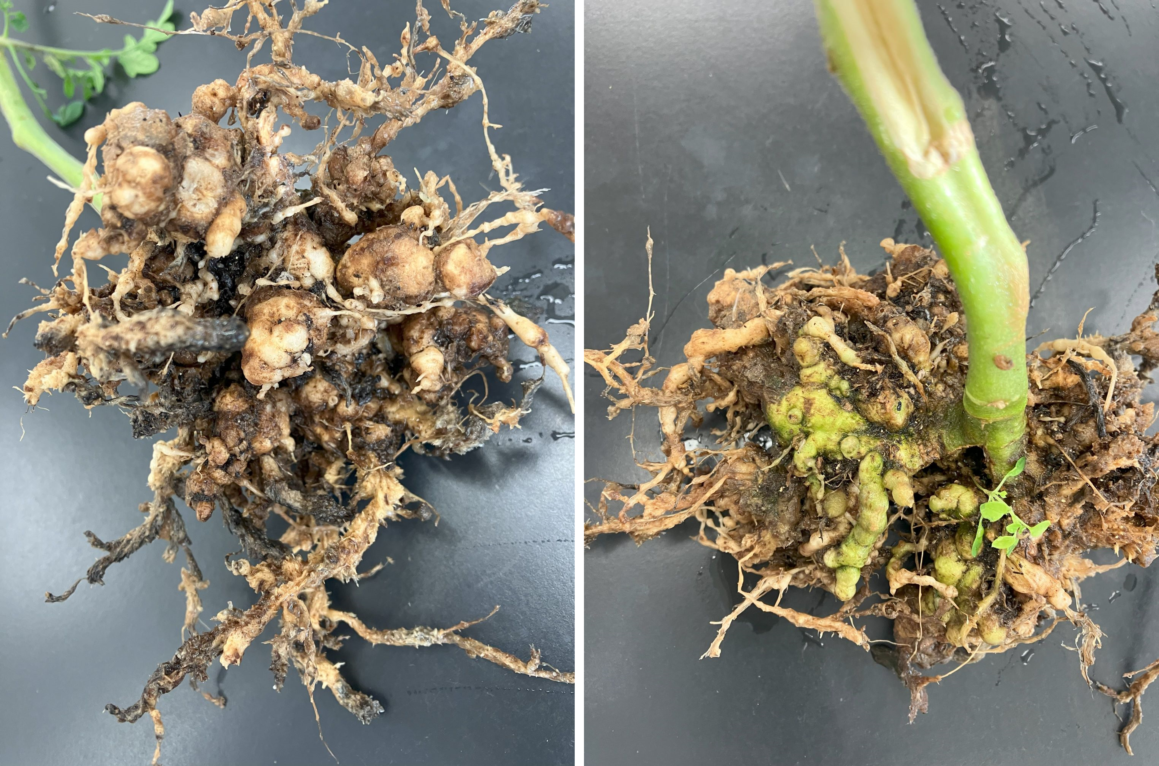 ネコブセンチュウは、その名の通り植物の「根」に「コブ」を形成します。体長は2齢幼虫で0.4 mmほど、肉眼では確認できませんが、根に形成されるコブは肉眼で容易に見つけることができます。