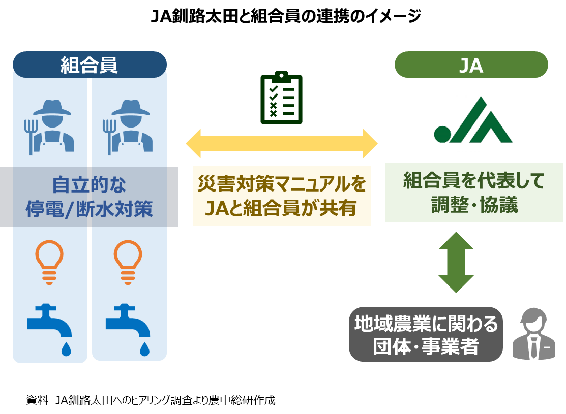 JAと組合員による連携の特徴は、組合員が自立的な防災対策・災害対応を行い、JAはそのサポートの役割を担っている点です。