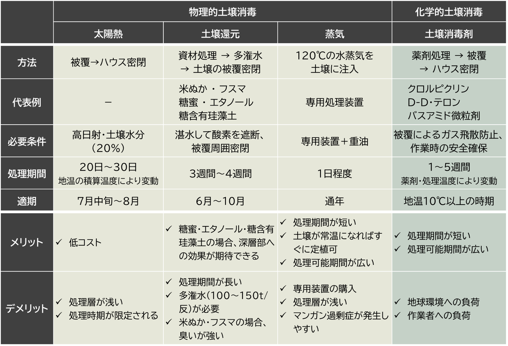 土壌消毒といっても、熱を利用した物理的土壌消毒、薬剤を利用した化学的土壌消毒、対抗作物を利用した生物的土壌分析など様々な方法があり、効果のある対象も異なります。