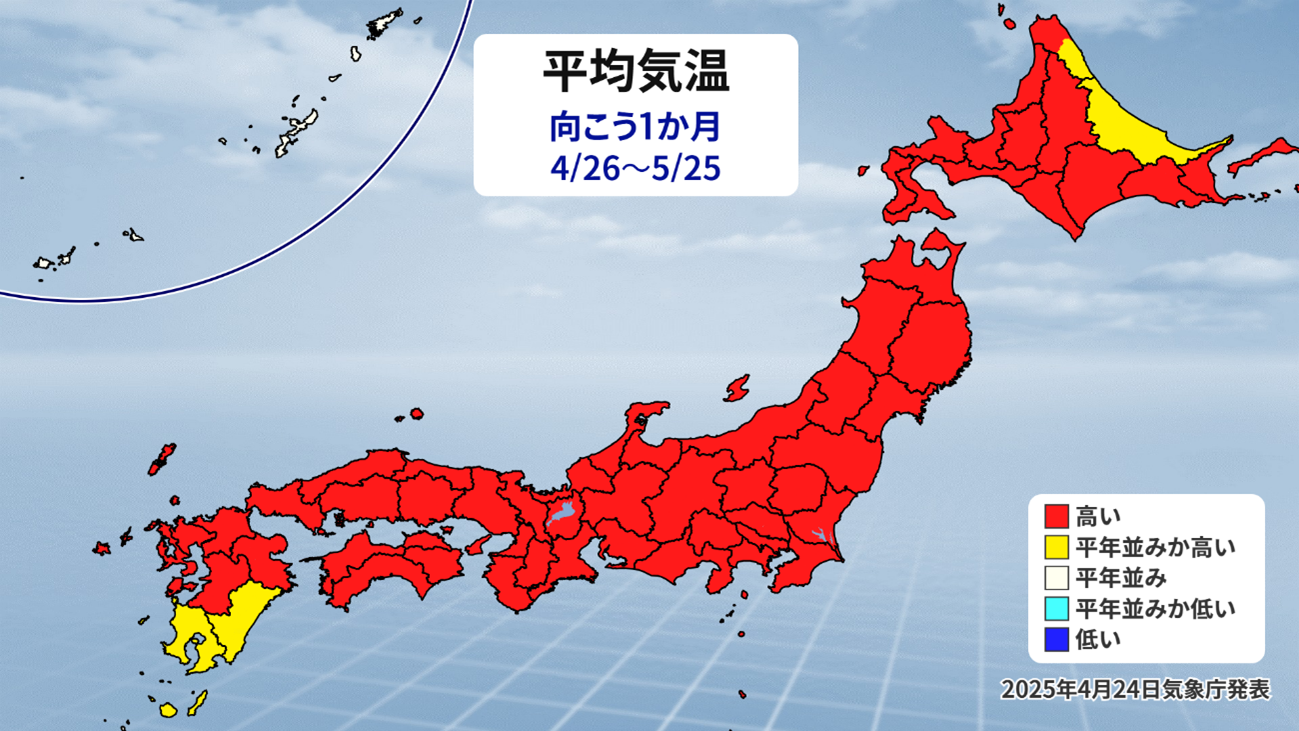 続いて、1か月予報(平均気温)は、全国的に平年より高い傾向となっています。