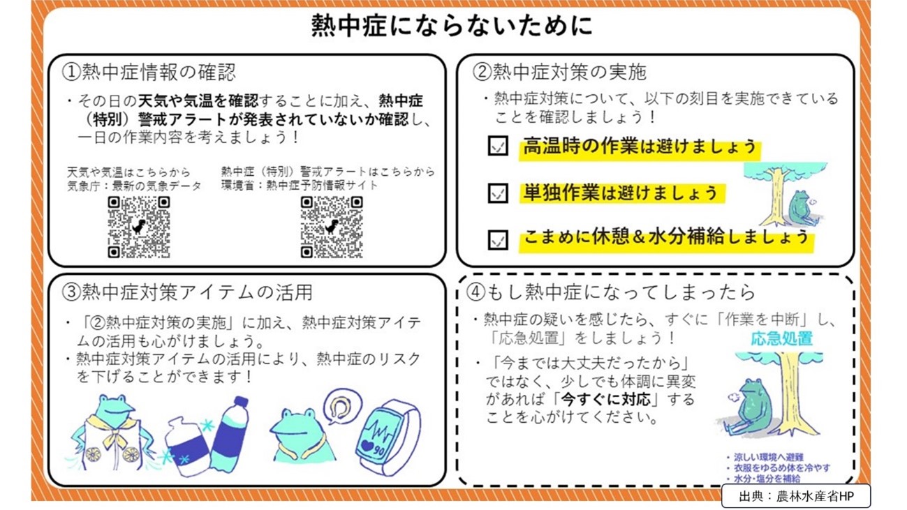 農林水産省HPには、農業者が熱中症にならないための対策をまとめていますので、紹介します。なかなか作業を完全にストップさせる事は現実的に難しいかもしれません。