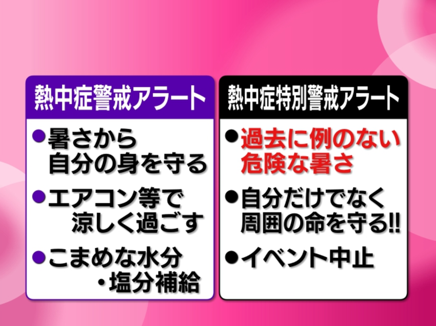 暑さ指数35が予想される時は、さらに一段階上の「熱中症特別警戒アラート」が発表されます。こちらは暑さ版特別警報という認識でよいかと思います。過去に例のない危険な暑さとされ、人の健康に関わる重大な被害が生じるおそれがあります。