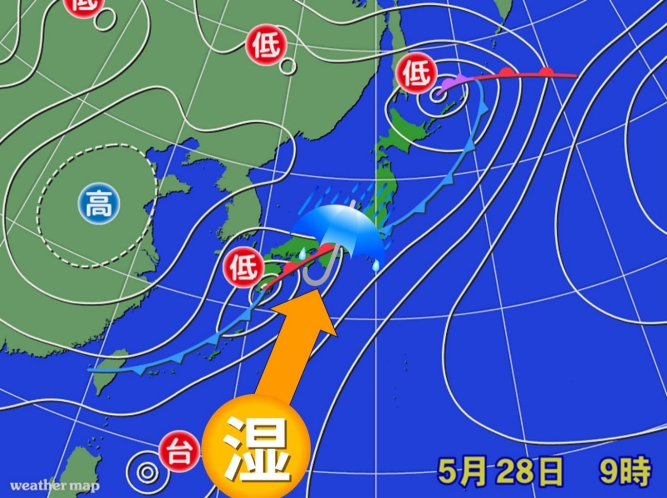 5月は晴れる日が続いた後の、1回の大雨に注意が必要な時期なんです。昨年5月28日の天気図を例にあげます。