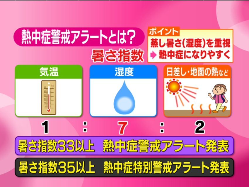 そうした今まで気温では分からなかった、日差しや湿度と言った要素を取り入れたのが「暑さ指数」であり、これが熱中症警戒アラートの基準なのです。