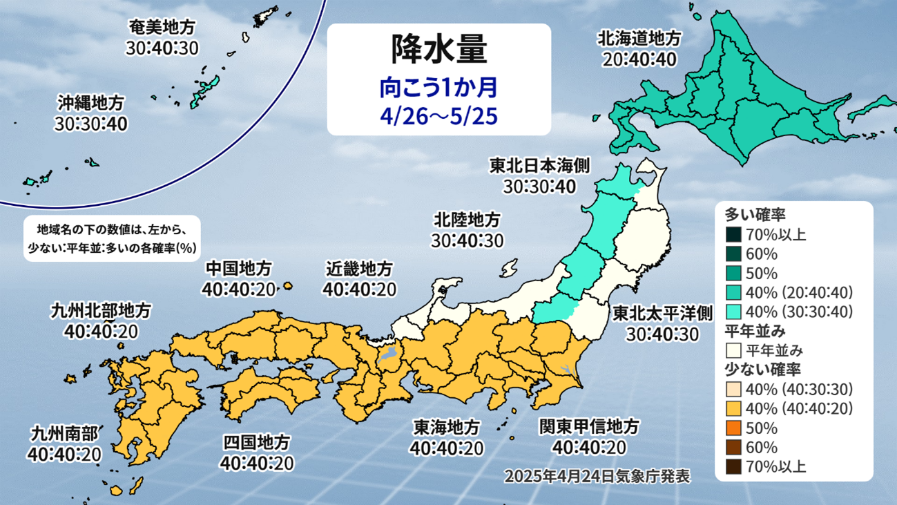 1か月間予報の降水量を見ていきます。東日本・西日本は概ね晴れる傾向で、降水量は平年並みか少ない予想となっています。一方で、北海道や東北の日本海側は平年並みかやや多い予想です。